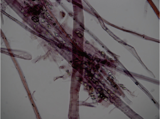 構皮紙還有一個非常重要的特征是除纖維細胞外,紙張纖維中還能見到大量的草酸鈣晶體(如圖4),多呈菱形或者正方形,常存在于薄型細胞的腔內或者細胞與細胞之間,造紙過程中的打漿和漂洗程序會使草酸鈣晶體流失,因而一些制作精細的構皮紙中殘留的草酸鈣晶體相對少見。